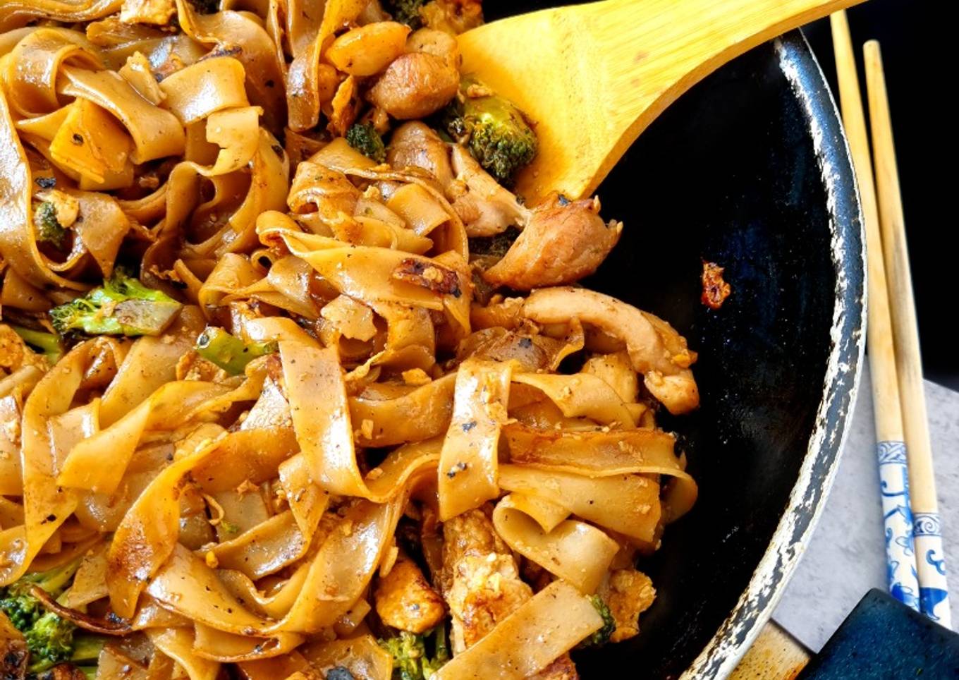 Pad see ew noodles de arroz con pollo y brócoli
