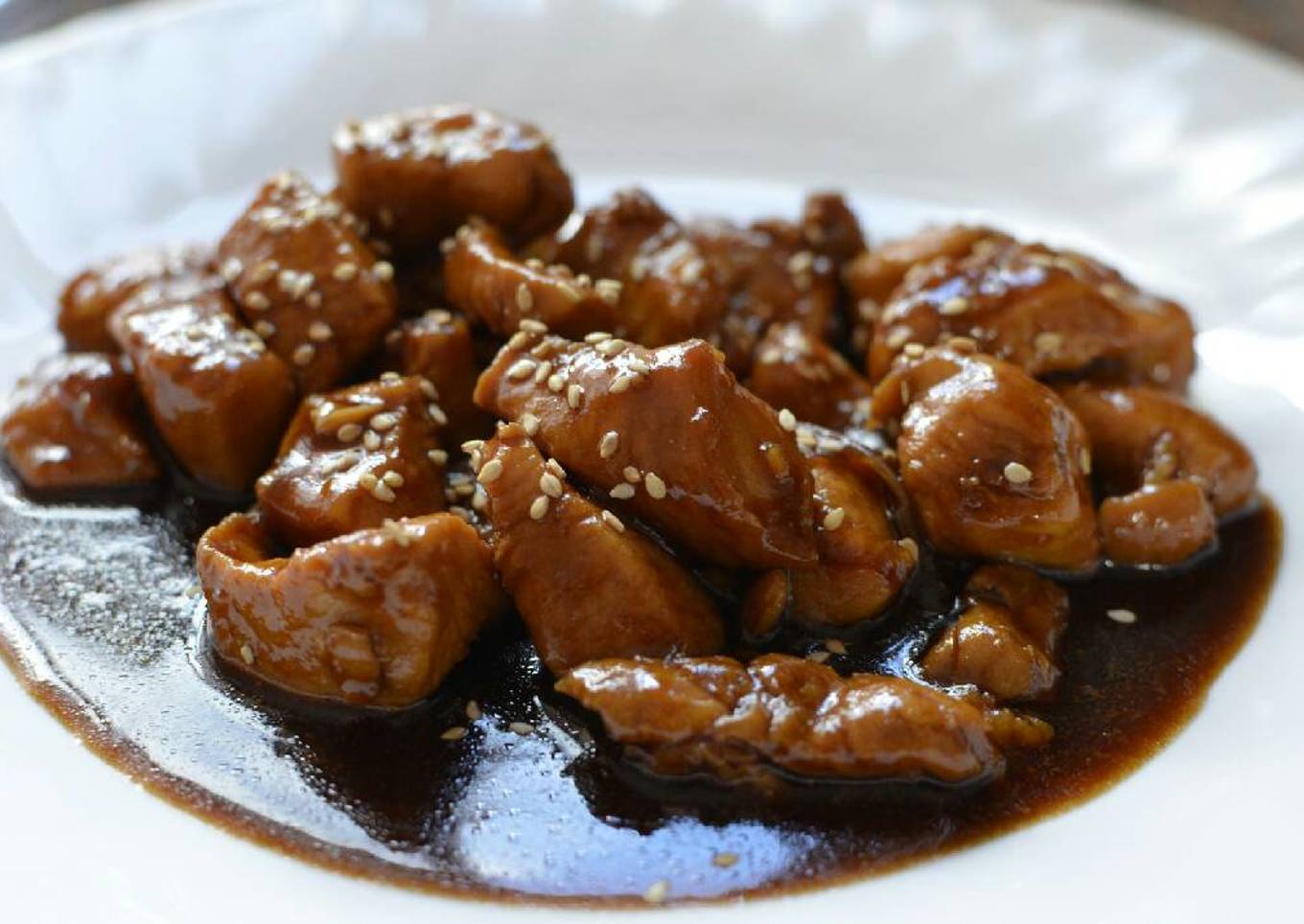 - Cuando la pechuga este dorada incorporamos la salsa teriyaki y a fuego medio reducimos hasta que la salsa este caramelizada removiendo de vez en cuando. Aproximadamente 5 minutos. Si no espesa se puede añadir un poco de maicena mezclada con medio dedo de agua (como medida, no vayas a cortar un dedo) de un vaso de café.