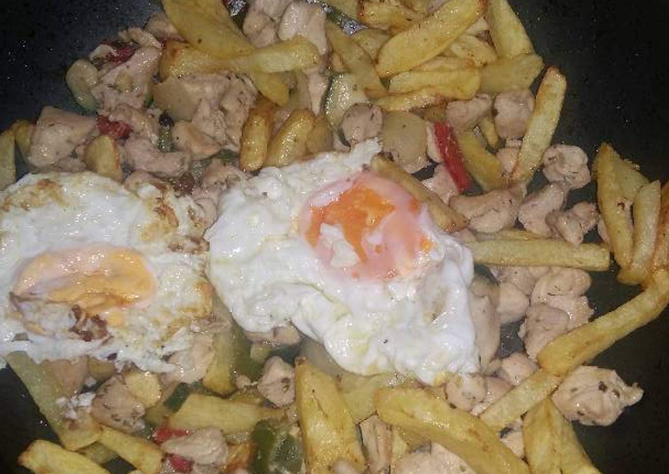 - Cuando ya lo tengamos freímos los dos huevos y los añadimos encima y lista nuestra sartén casera