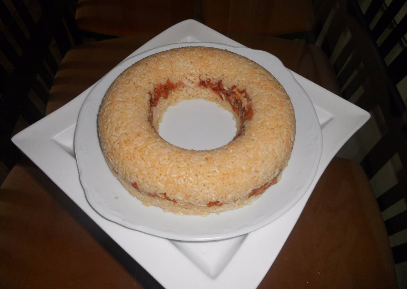 - Partir, con tijeras, en trozos pequeños, el chorizo (yo puse uno y medio), la gallina y el jamón, mezclarlo bien todo y en un molde poner una capa de arroz, encima toda la mezcla de la gallina, el chorizo y el jamón y encima otra capa de arroz, se puede tomar frío o templado. Y QUE APROVECHE