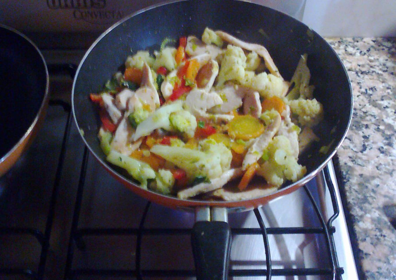 - Cortamos las supremas en tiritas, las salteamos aparte con el aceite de oliva, nuez moscada y la salsa de soja, cuando estén un poquito doradas, agregarlas dónde se encuentran los vegetales.