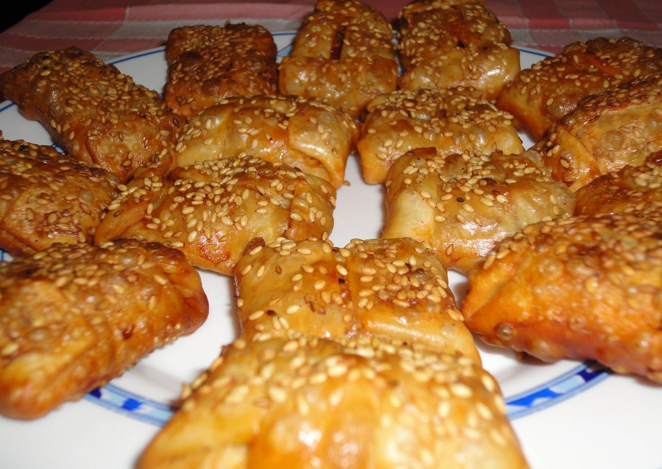 - Pintamos con huevo la empanadilla resultante y la espolvoreamos con sésamo. Repetimos el proceso con el resto de obleas.