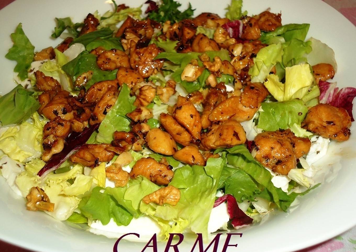 - Cubrir el queso con más ensalada y acabar con los trocitos de pollo y nueces en salsa de soja. Si es necesario se pone un poco más de aceite.