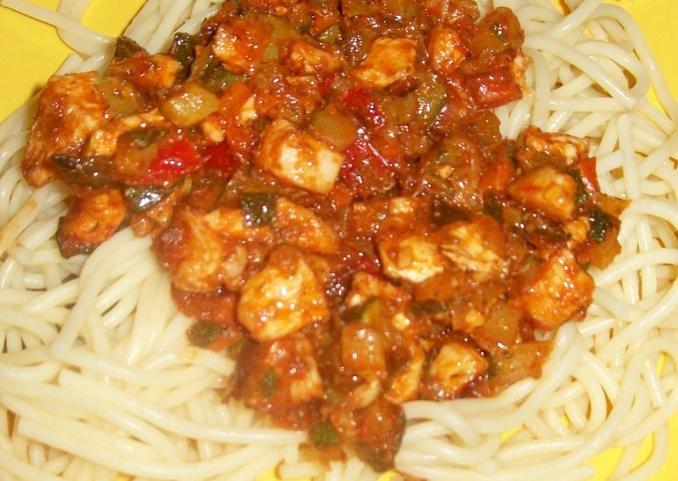 Espaguetti con verduras rehogadas (zanahoria, calabacín, pimiento amarillo, cebolla y tomate frito) con pollo, si sirve espolvoreado de queso.