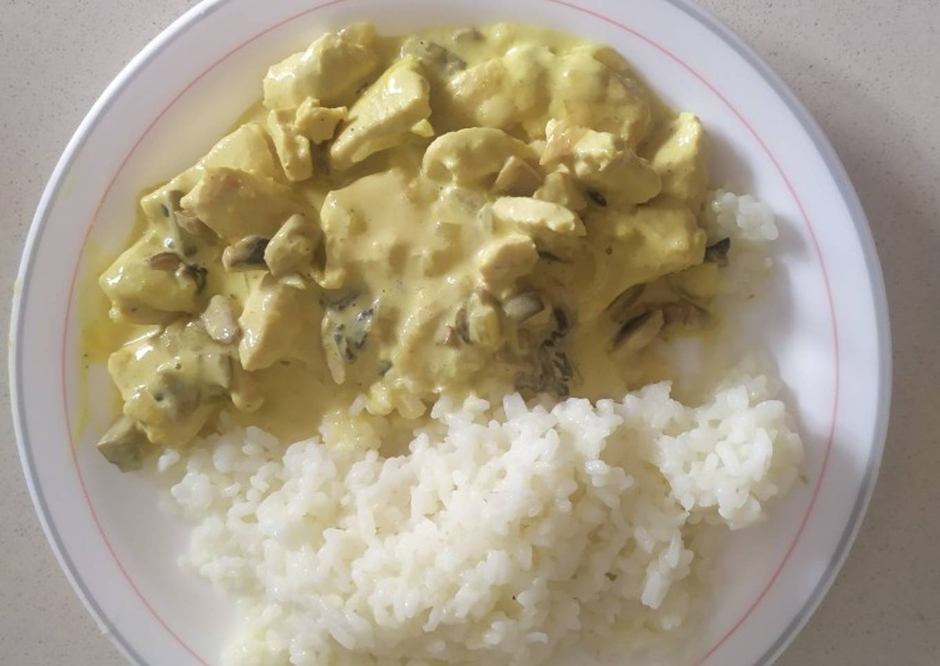 - En la misma sartén pochar la cebolla y los champiñones. Una vez listos incorporamos la nata, una pizca de pimienta, la sal y el curry (pongo más o menos una cucharada, pero voy probando por si quiero más o menos sabor). Dejamos cocinar unos 15 minutos a fuego lento (yo le añado leche si veo que queda demasiado espeso).