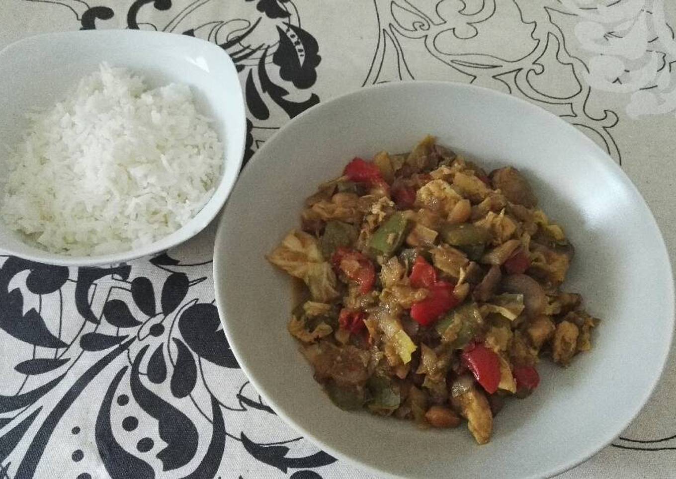 Pollo con curry y verduras acompañado de arroz basmati