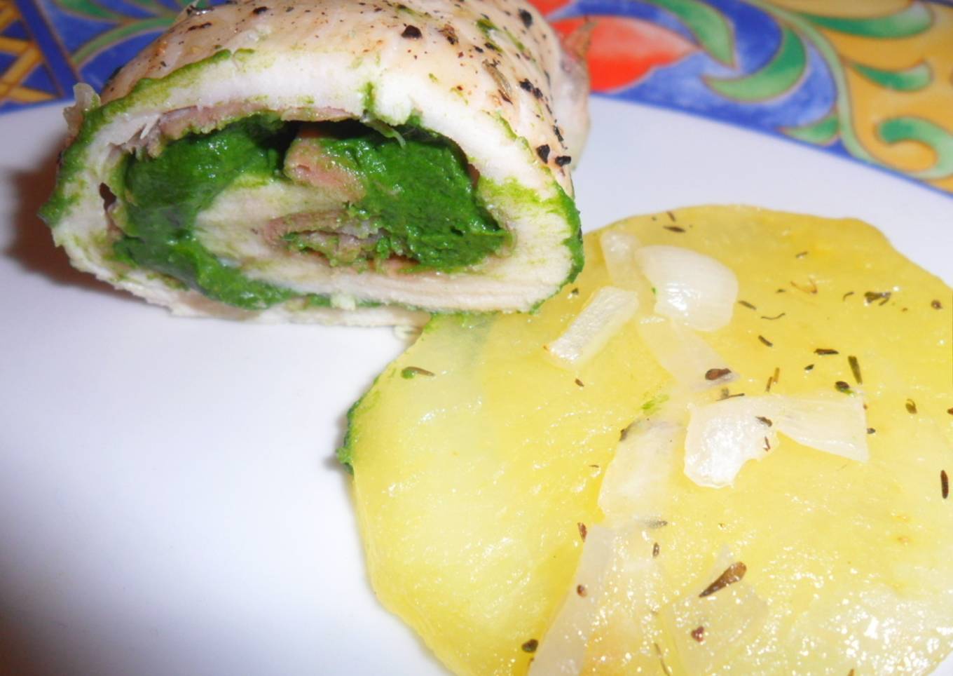 Pollo enrollado con jamón, queso y espinacas