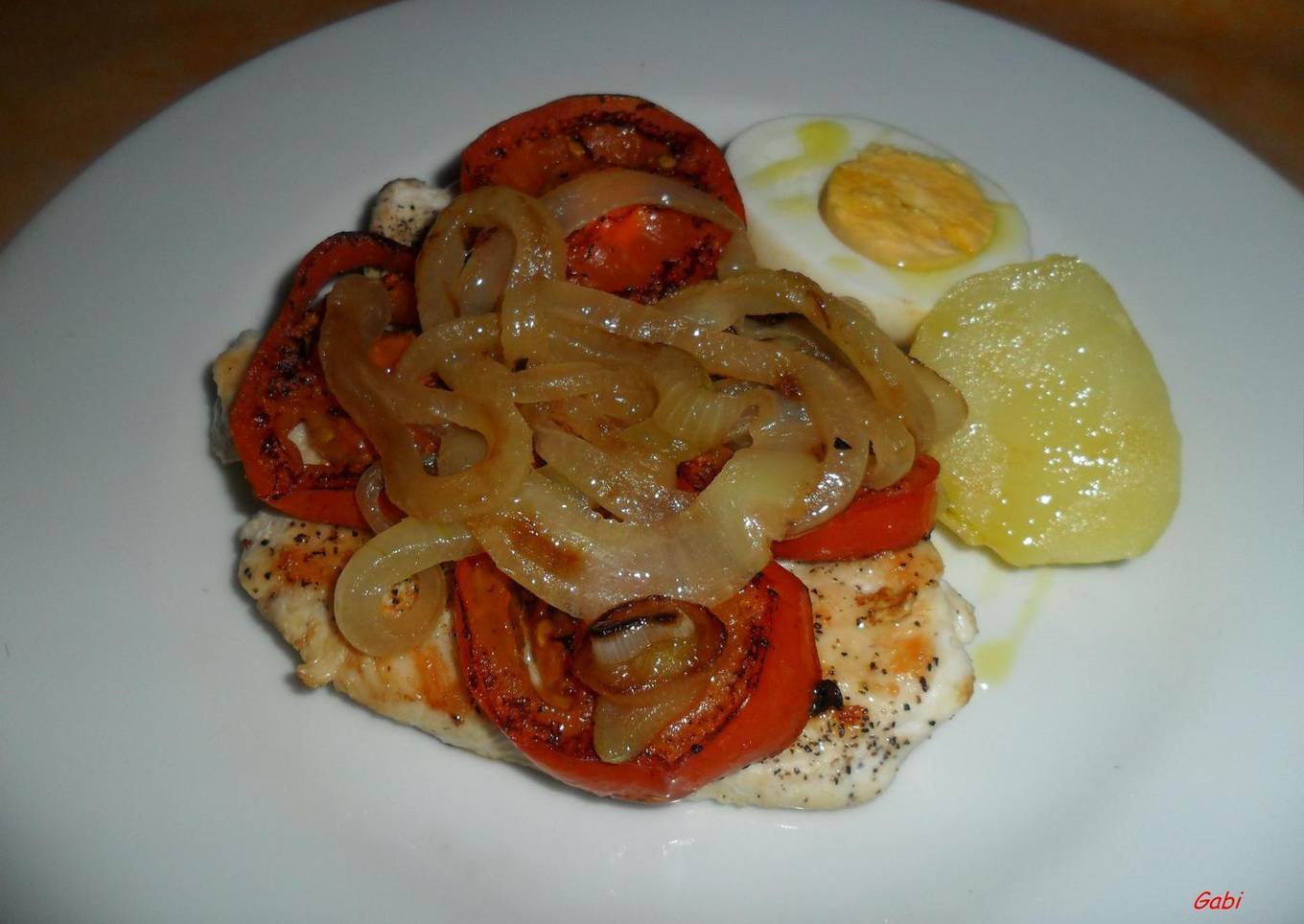 Un plato veraniego, ligero, simple, fácil de elaborar, filetes de pechuga de pollo a la plancha con rodajas (orejones) de tomate y aros de cebolla sofritos en aceite de oliva virgen extra.