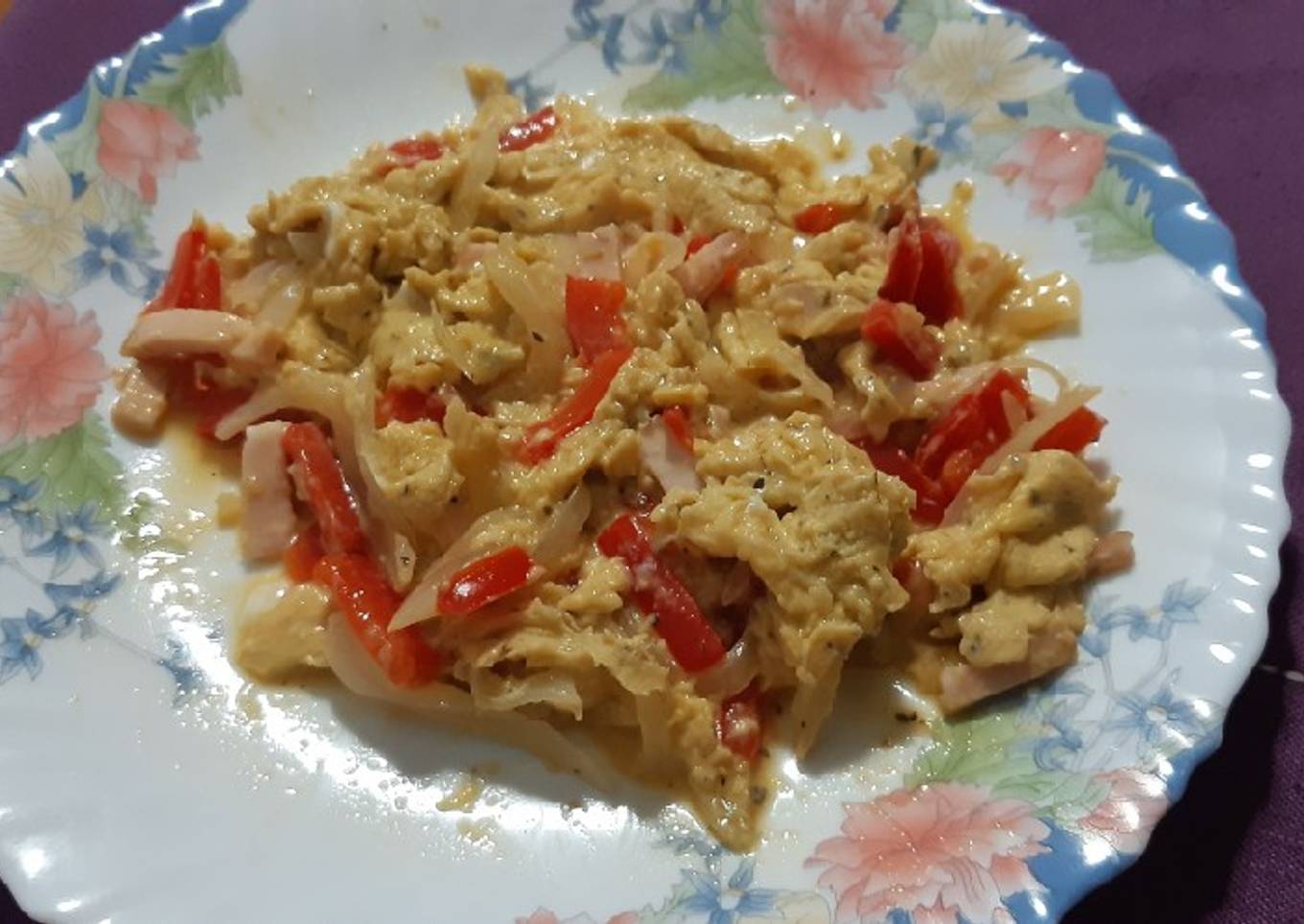 Revuelto de pimiento, cebolla y pechuga de pavo