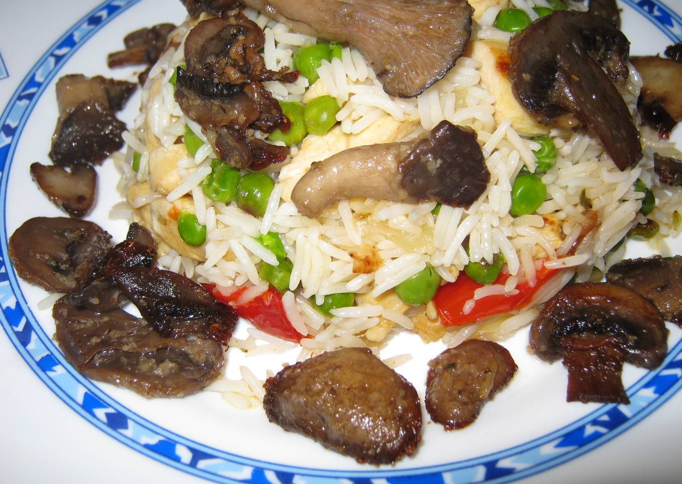 Arroz con pollo y pimientos acompañado de setas con ajo y perejil.