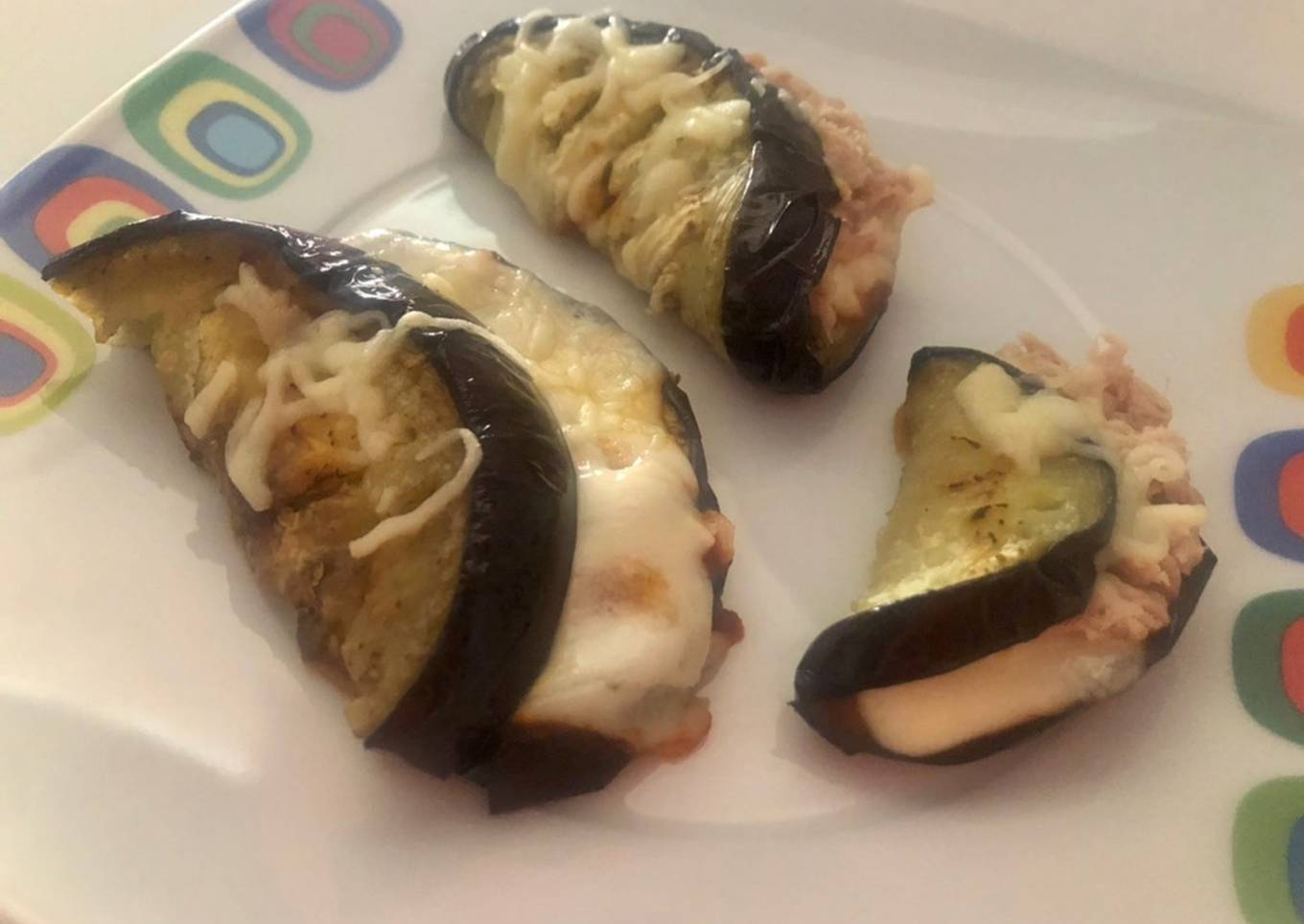 - Solo en la mitad de la rodaja: untamos con un poco de tomate, añadimos orégano, una cucharadita de atún y un trozo de queso.