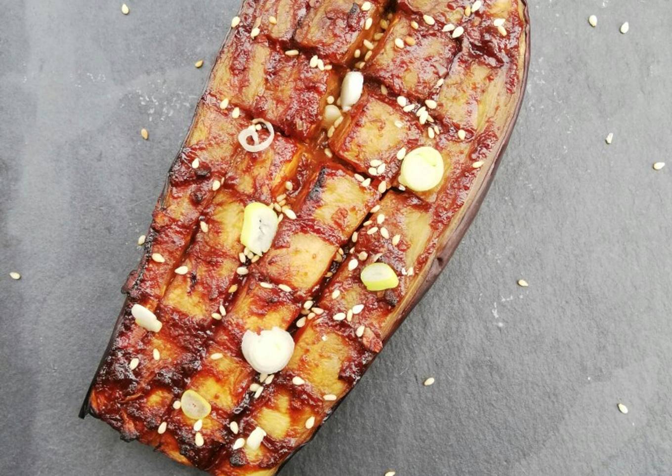- Pasado el tiempo de horneado, sacar las dos mitades de berenjena y extender la mezcla de miso por encima.