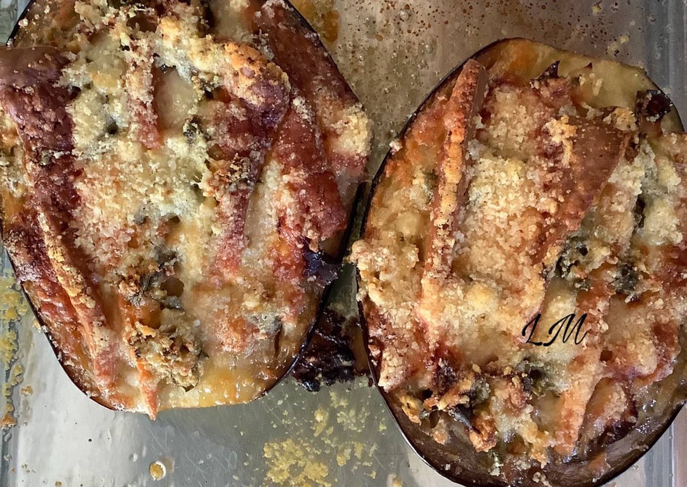 - Repartir la mezcla anterior por encima de las dos mitades de berenjenas.