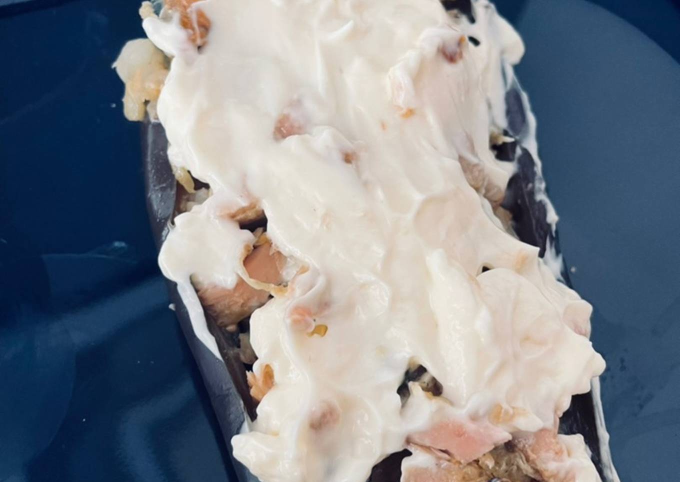 - Dejamos que se enfríen un poco y le añadimos la mahonesa por encima, yo le he puesto una que he hecho yo, pero si no te quieres complicar le puedes poner de bote 🤗