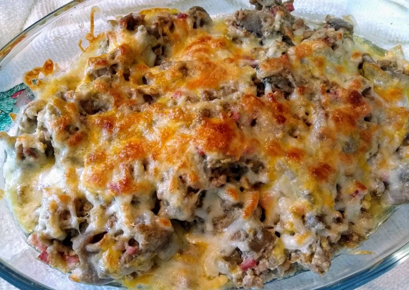 - Pasamos el guiso a una fuente para horno. Espolvoreamos queso rallado por encima y lo metemos en el horno. Gratinamos hasta que el queso se dore.