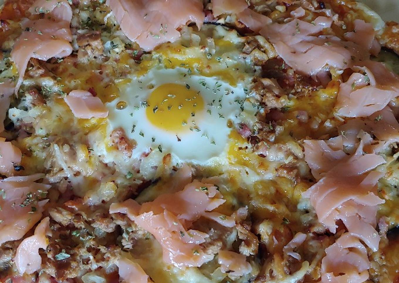 Pizza berenjena, huevo y salmón