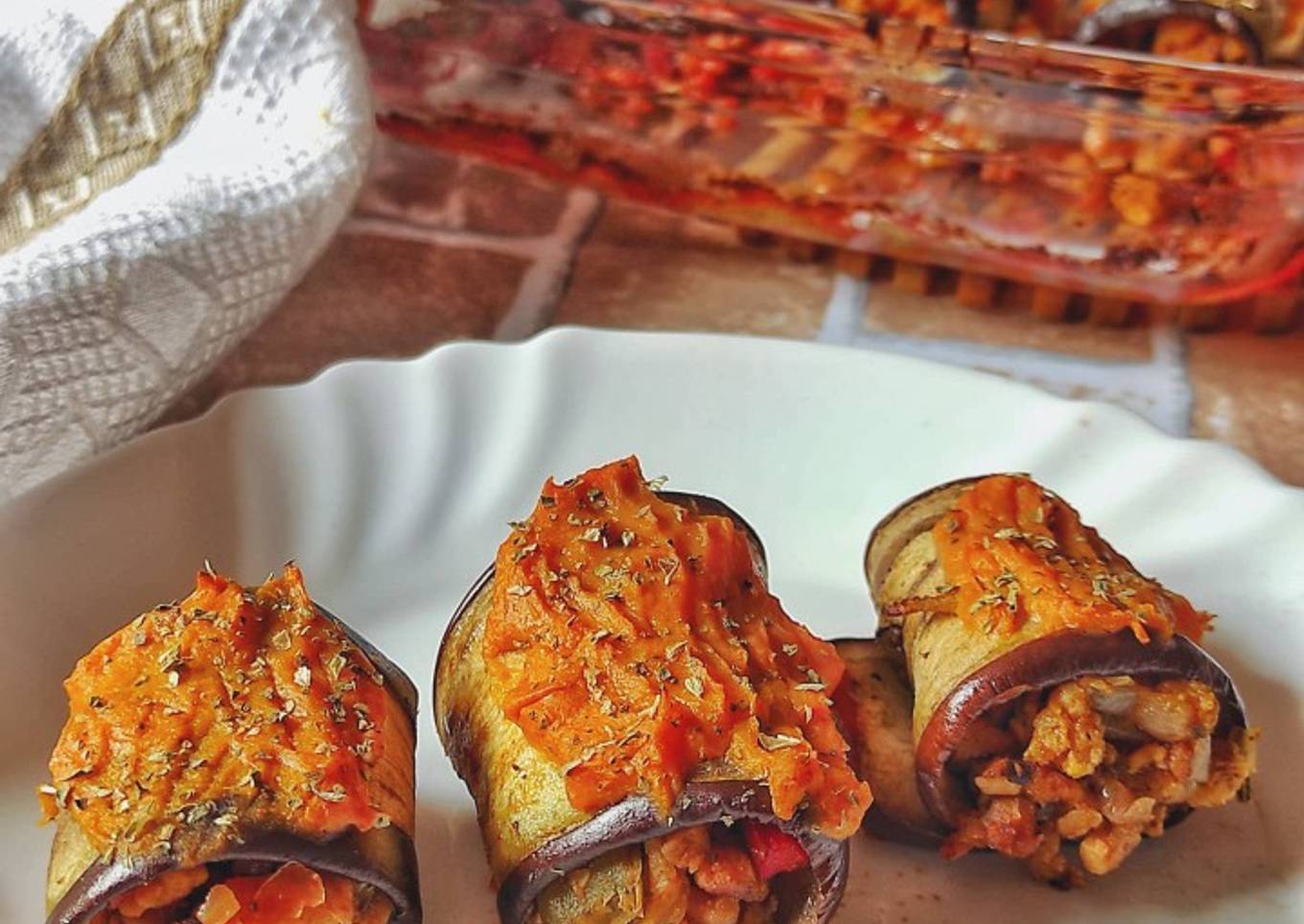 Cogemos las láminas de la berenjena y vamos echando relleno, enrollamos, y los vamos colocando en una bandeja con un poco de salsa de tomate en el fondo, echamos un poco de queso de boniato por encima y horneamos a 180° unos 25 minutos.