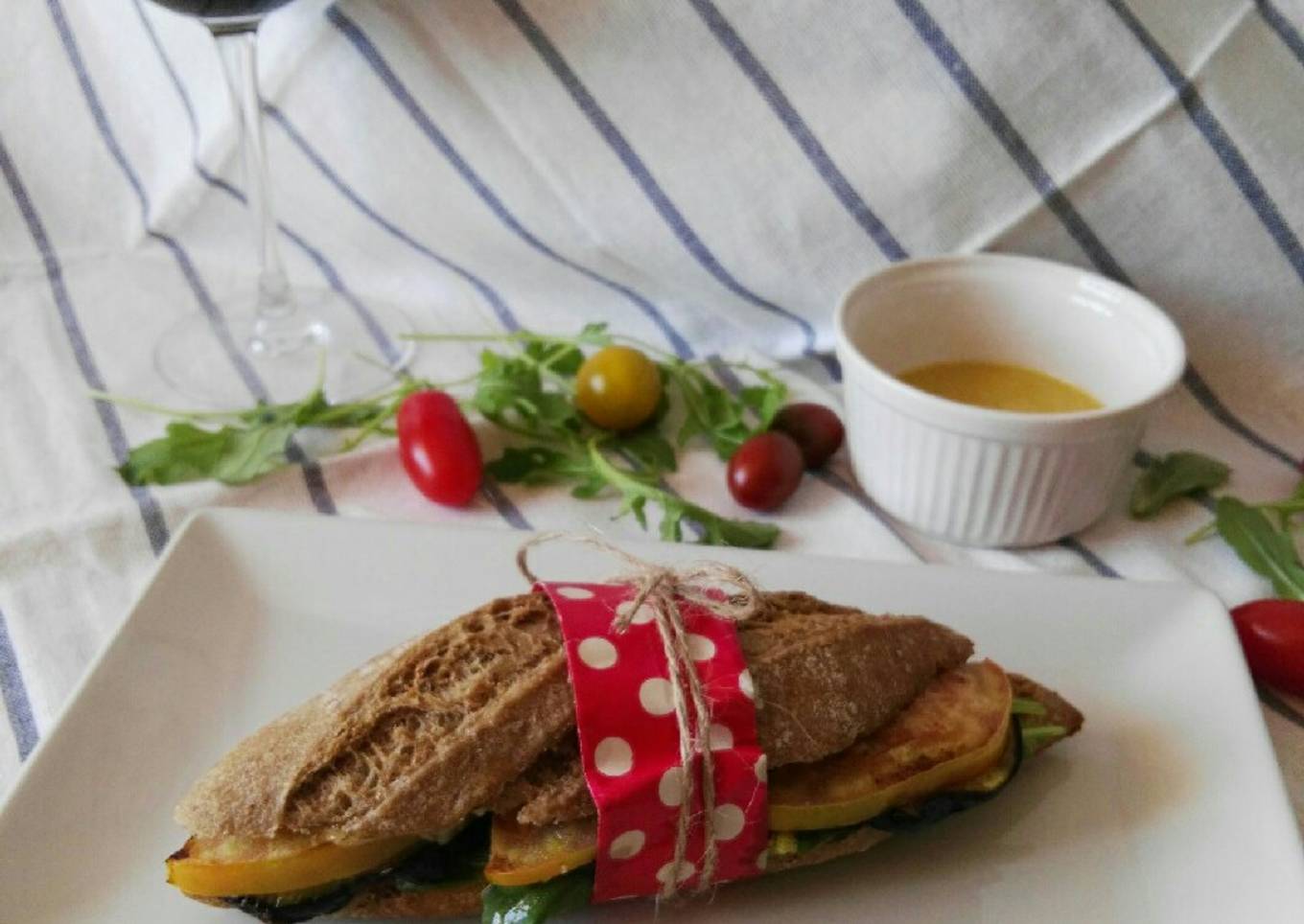 Bocadillo de berenjena y tomate con miel y vinagreta de mostaza