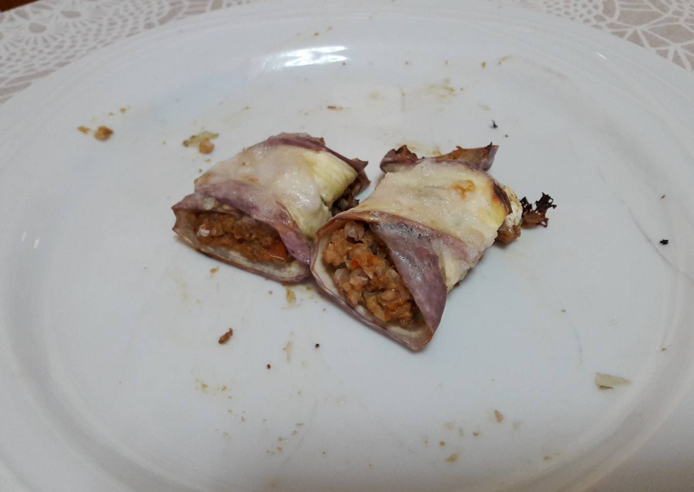 - Dejar que la mezcla del sarraceno se enfr铆e un poco y rellenar con ella los rollos de berenjena.
