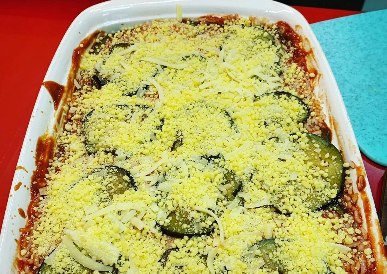 - Luego en una fuente para el horno: pones en el siguiente orden los ingredientes, salsa de tomate, arroz, berenjenas, queso. Se ponen 4 capas de lo mismo, se deja al último una capa de berenjenas con queso y de ahí al horno a 160 grados por 30 minutos y listo!
