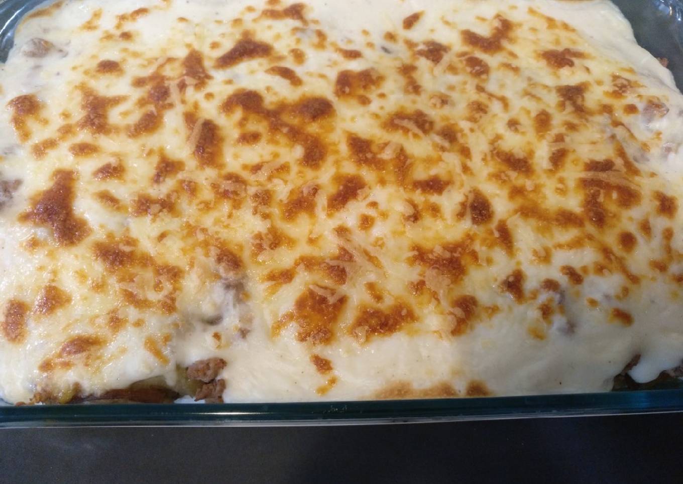 - Montamos el plato poniendo en la base las berenjenas, seguimos con la carne y por último la bechamel y el queso. Ya sólo nos queda gratinar y listo.