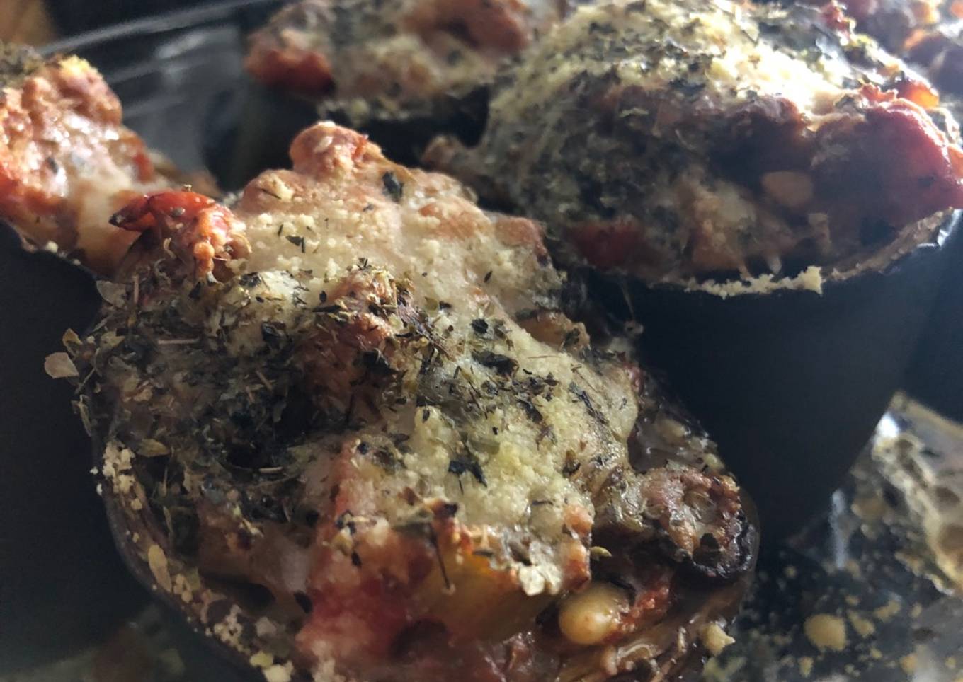 - Encima de las berenjenas rellenas ponemos el queso rallado y el orégano. Precalentamos el horno a 200 grados. Ponemos las berenjenas al horno durante 15 minutos. Servimos tibio. Que aproveche!!!
