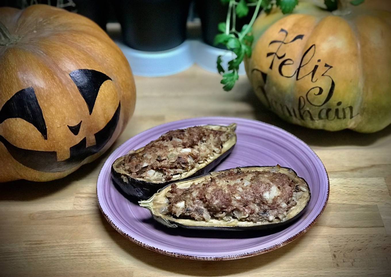 - Vaciamos la carne de las berenjenas — y las hacemos a parte, en una bandejita de horno—; y rellenamos con la mezcla de carne.
