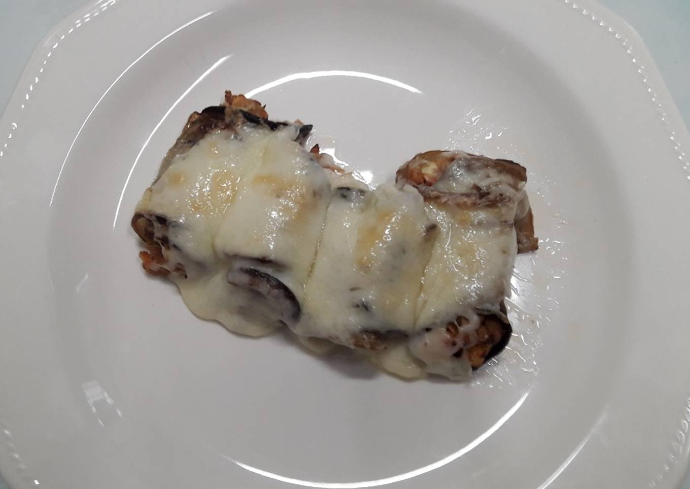 Tenía una berenjena que iba a hacer rellena, pero la corte a lonchas e hice estos canelones.