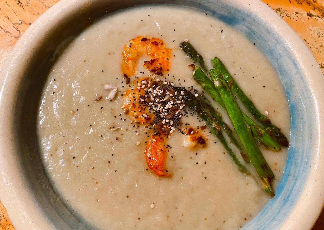 - Decoramos con unos langostinos y trigueros a la plancha. Espolvoreamos un mix de pipas y semillas y lista para comer!