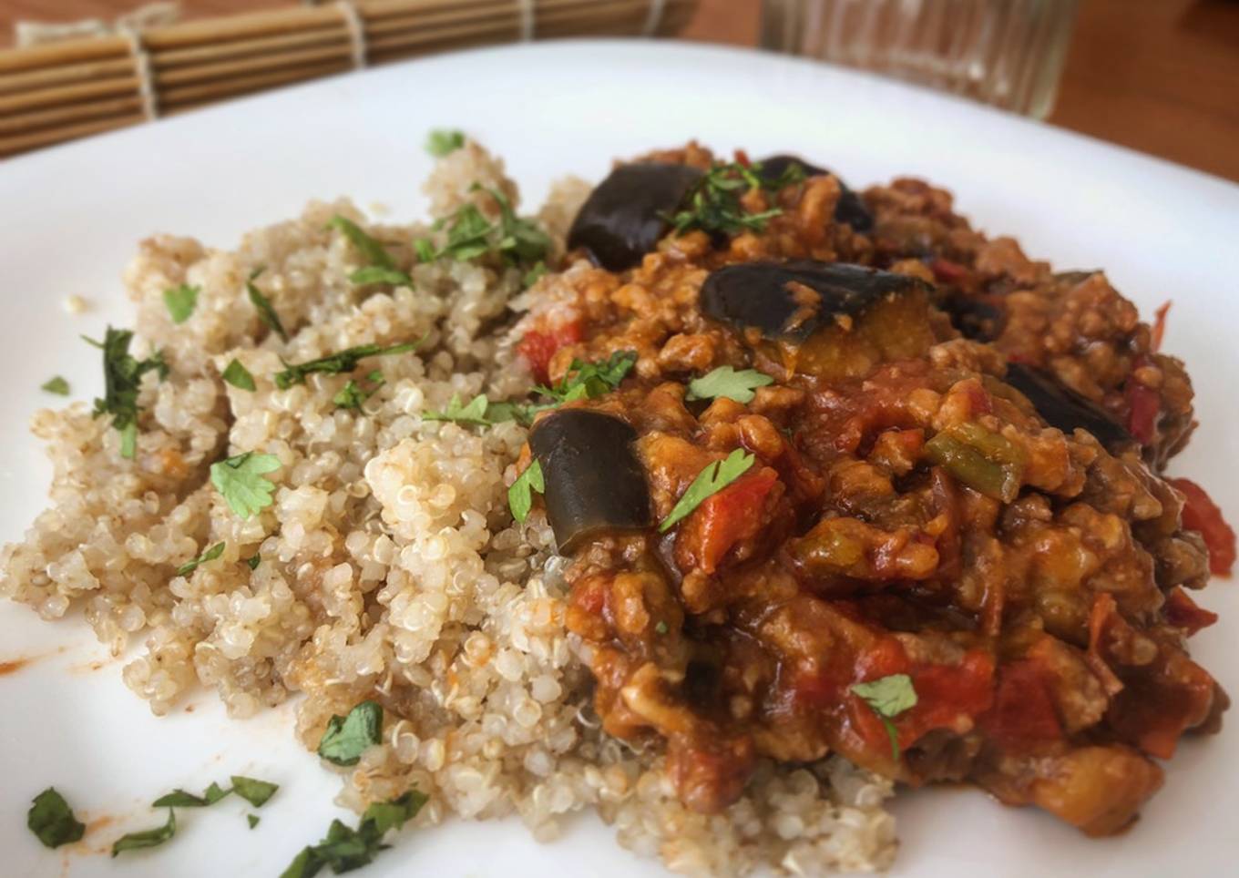 Quinoa integral con picada de ternera y berenjena