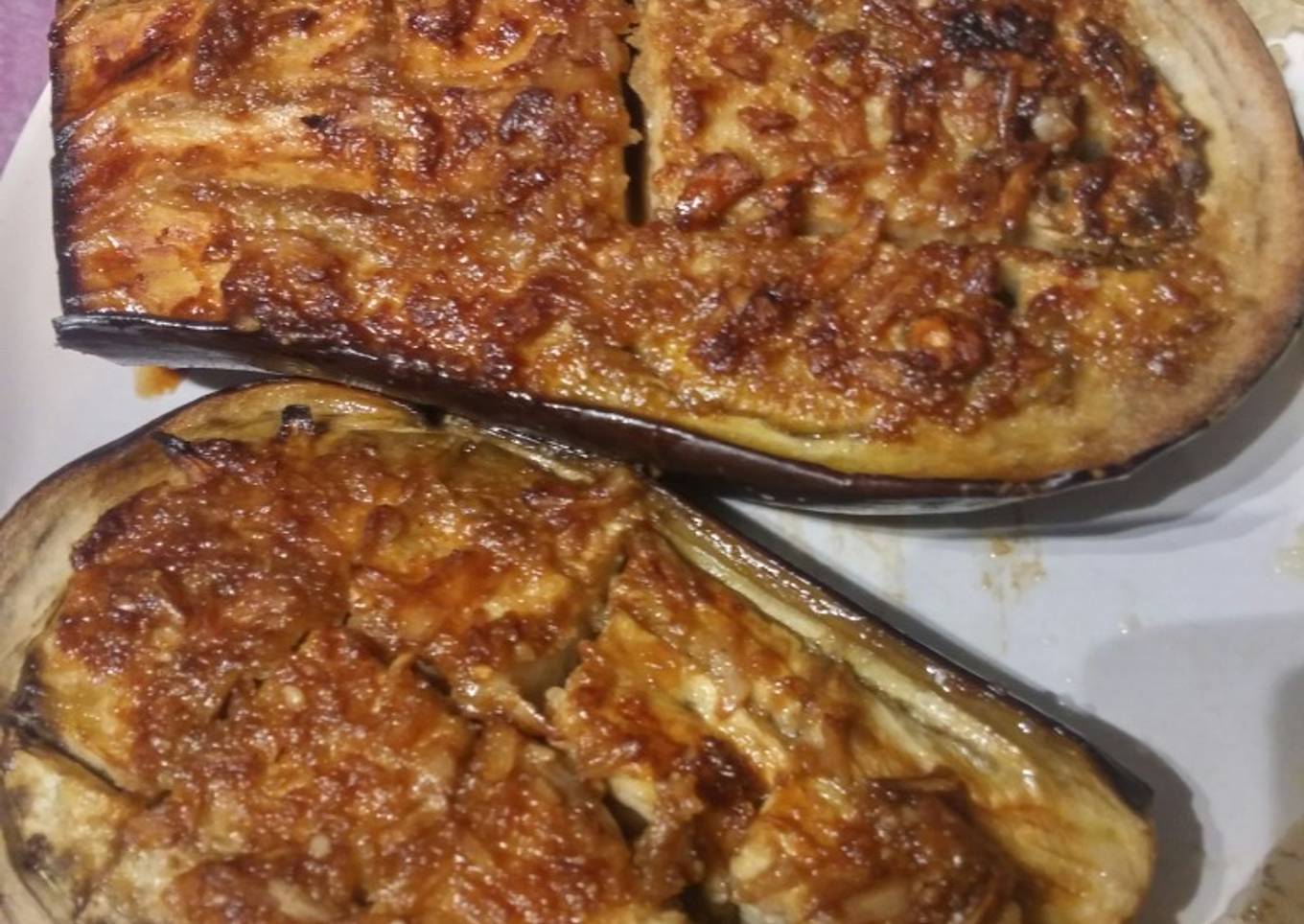 - Echar la pasta del mortero por encima de la berenjena. Los cortes ya se habrán abierto y la pasta se repartirá bien por toda la carne de la berenjena.