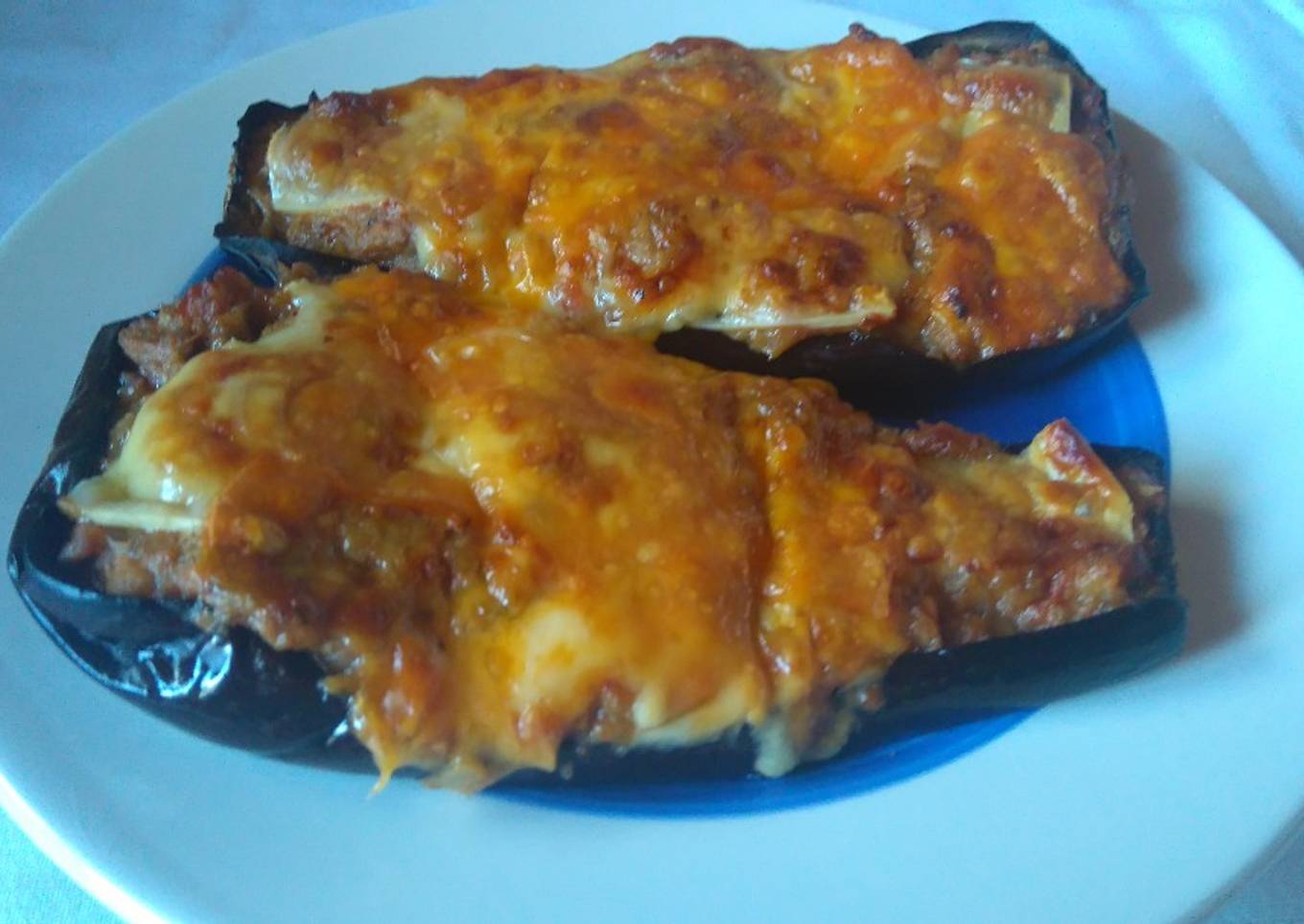 - Colocamos la mezcla de carne dentro de las mitades de las berenjenas, echamos queso por encima y gratinamos en el horno unos minutos hasta que se funda el queso.