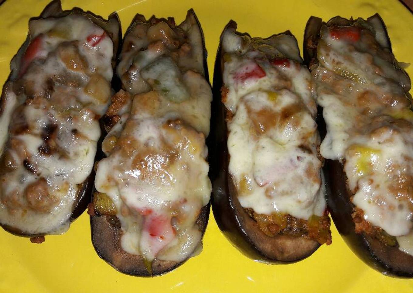 - Rellena las berenjenas con la mezcla y pon una loncha de queso sobre cada una.