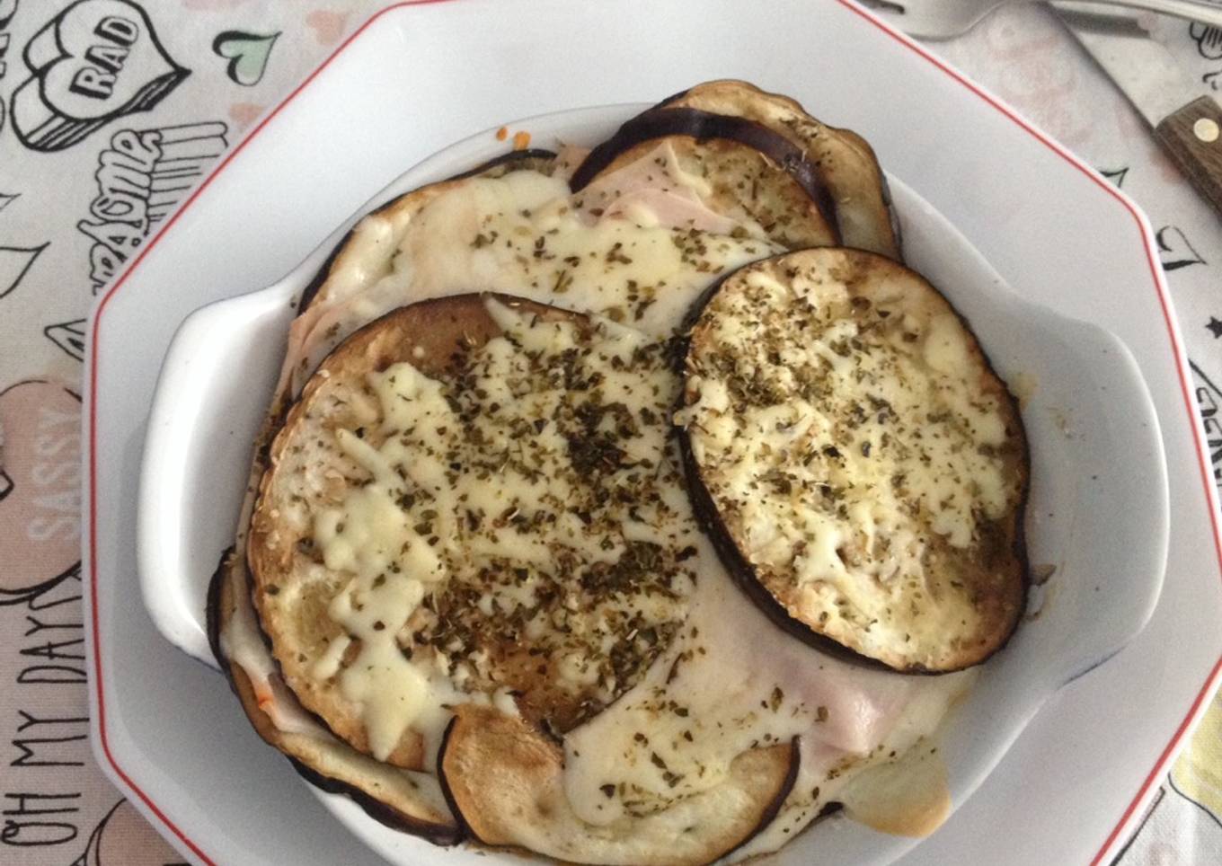 - Ponemos al fondo de la cazuelita una base de berenjena, cubrimos con lonchas de jamón y lonchas de queso(esto al gusto), cubrimos con otra capa de berenjena y otra capa de jamón y queso y acabamos con otra capa de berenjena.