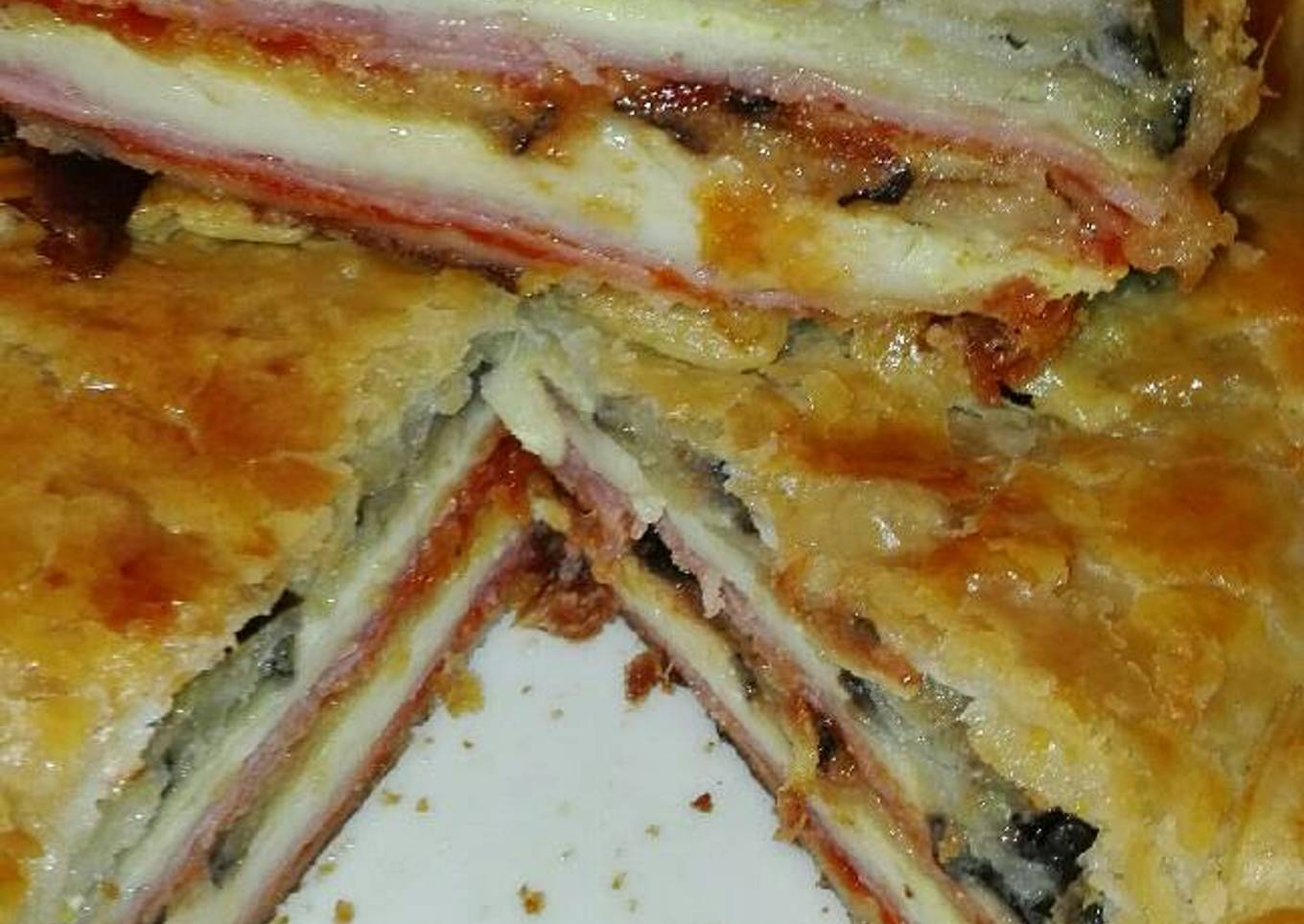 - Cogemos un molde desmontable untamos con mantequilla y harina y ponemos una lámina de hojaldre, cubrir bien el molde ponemos un poco de salsa de tomate y encima el jamón york y encima del jamón de york lonchas de queso cubriendo bien todo el jamón york cubrimos el queso con la mahonesa luego cubrimos con berenjenas y encima de las berenjenas.