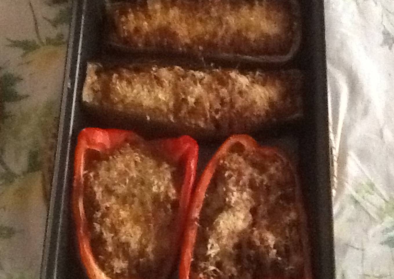 - Colocamos las mitades de pimiento y berenjena en una fuente de horno engrasada con un poco de aove y las rellenamos con el sofrito de carne picada. Picamos el queso grana padana por encima y metemos al horno 15 ' (estara precalentado a 180 grados previamente) LISTO ¡ buen provecho