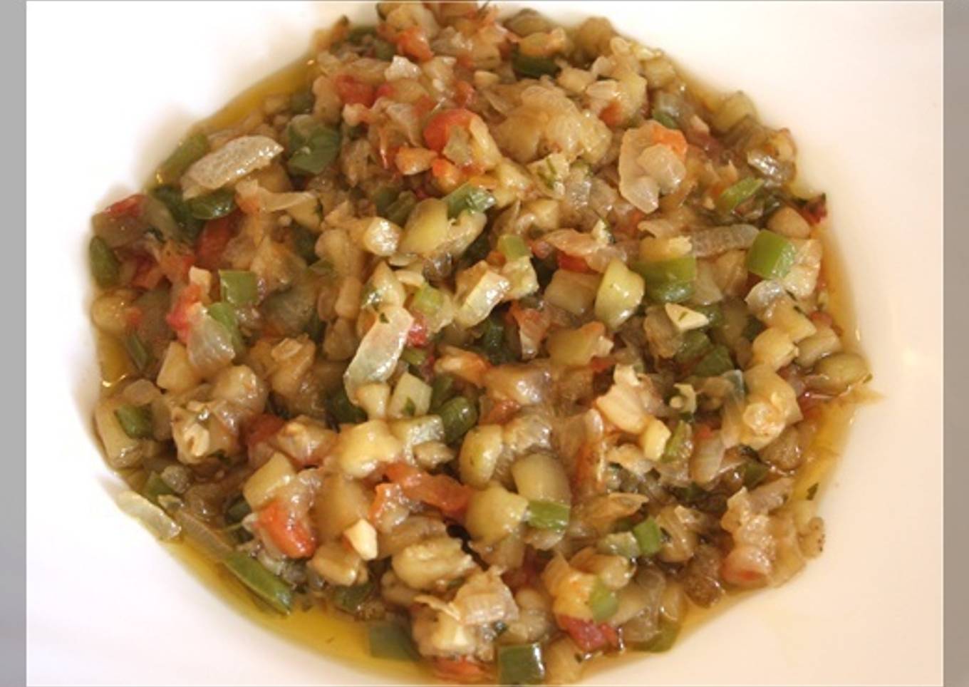 Pescado con sofrito de berenjenas, cebolla, tomate y pimiento. Va bien para carnes rojas, pescados pollo, tostadas y pizzas