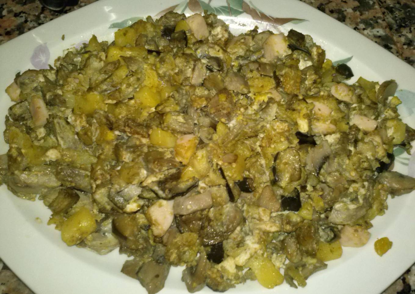 Revuelto de berenjenas, champiñones, patatas y pavo.