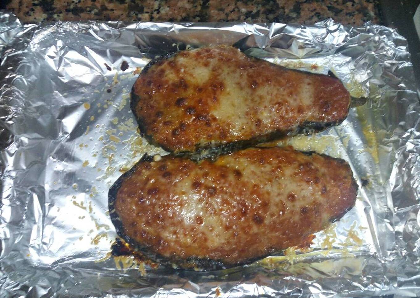 - En una bandeja, colocamos las berenjenas, hacemos el relleno y cubrimos con la salsa de tomate. Rallar el parmesano y colocar al horno, aproximadamente 30 minutos.